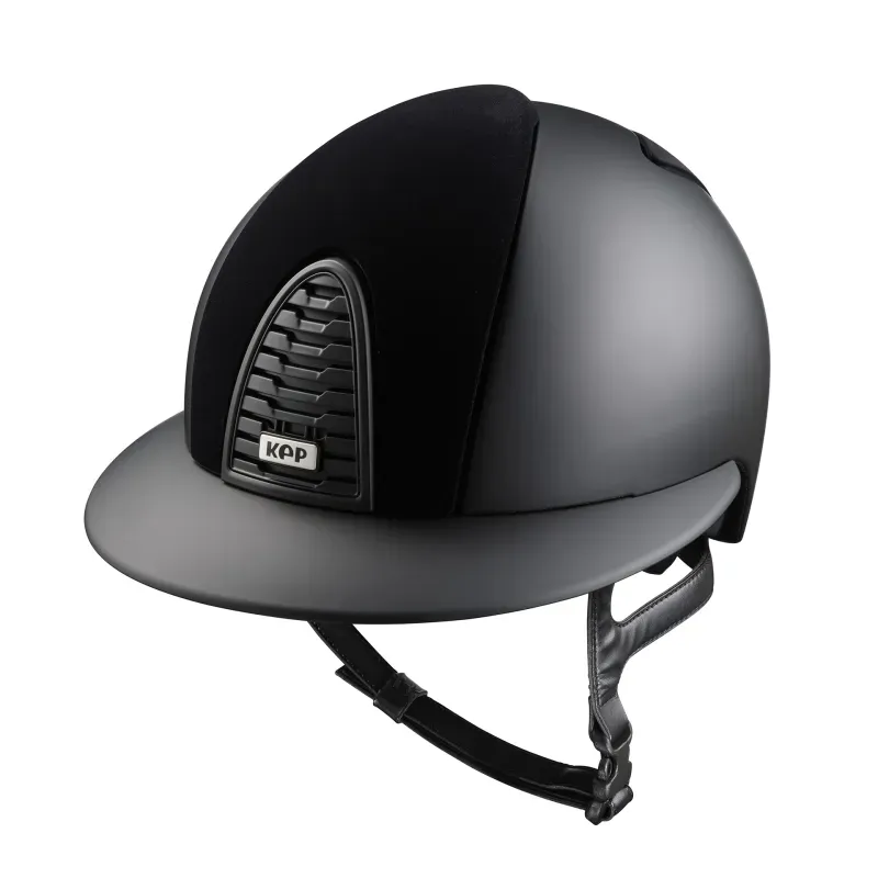 El barboquejo de cuero auténtico con cinco puntos de anclaje garantiza un ajuste estable y seguro, mientras que el acolchado ecológico es desmontable y lavable a 30 °C. El casco incorpora un microchip integrado conectado a la KEP App para almacenar información médica en caso de necesidad. Se suministra con visera modelo jockey. Peso: 500 g talla M y 535 g talla L.