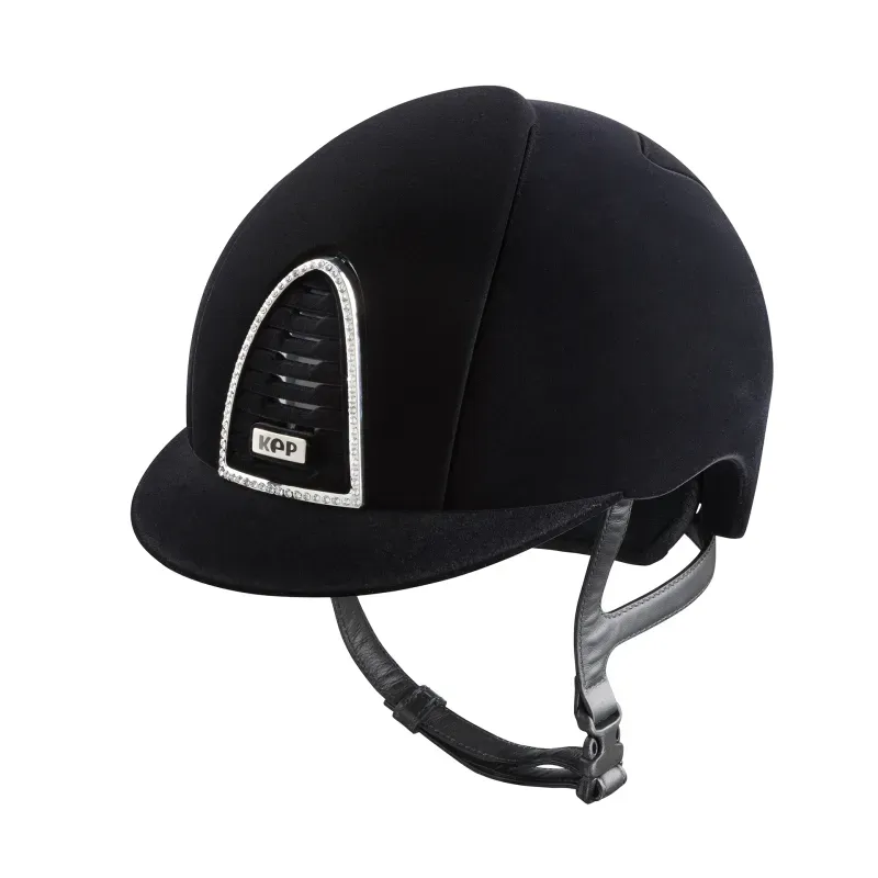 Reithelm mit schwarzem Samtbezug und verchromtem Rahmen mit Swarovski® Kristallen.